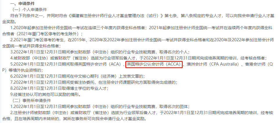 為繼續(xù)推進(jìn)福建省注冊會計(jì)師行業(yè)人才培養(yǎng)戰(zhàn)略,加強(qiáng)全生命周期人才培養(yǎng)工作,促進(jìn)注冊會計(jì)師行業(yè)持續(xù)健康發(fā)展。2023年3月17日,福建省注冊會計(jì)師協(xié)會發(fā)布《關(guān)于申報(bào)2022年度行業(yè)人才基金獎勵的通知》。其中,2022年取得特許公認(rèn)會計(jì)師(acca)資格及符合相關(guān)條件的專業(yè)人才可申請行業(yè)人才基金獎勵3000元。具體通知內(nèi)容如下: