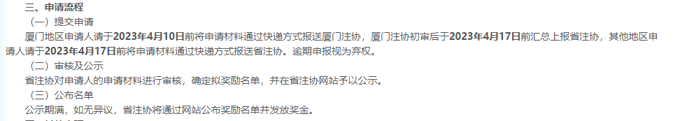 廈門地區(qū)申請人請于2023年4月10日前將申請材料通過快遞方式報(bào)送廈門注協(xié),廈門注協(xié)初審后于2023年4月17日前匯總上報(bào)省注協(xié),其他地區(qū)申請人請于2023年4月17日前將申請材料通過快遞方式報(bào)送省注協(xié)。逾期申報(bào)視為棄權(quán)。