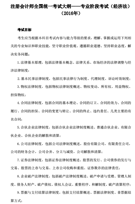 2016年注冊會計師報名時間為3月31日至4月29日,東奧會計在線將及時發(fā)布2016年注會考試報名相關(guān)信息。2016年注冊會計師全國統(tǒng)一考試大綱專業(yè)階段和綜合階段已發(fā)布。以下是《經(jīng)濟(jì)法》科目的考試大綱。