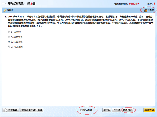 如果在做題過程中遇到難題,暫時(shí)得不出答案,可以使用“標(biāo)記本題”按鈕做標(biāo)記,等所有題目做完時(shí),通過“試題列表”按鈕,我們可以查看哪些題做了標(biāo)記,需要重新做,這兩個(gè)按鈕替代了以為筆試時(shí)考生在試卷上做標(biāo)記,并且更方便我們查找標(biāo)記題,也避免在做題過程中有漏題的現(xiàn)象發(fā)生。