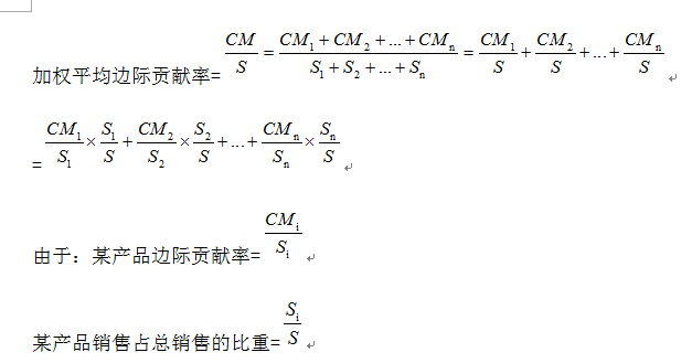 所以:加權(quán)平均邊際貢獻(xiàn)率=∑(各產(chǎn)品邊際貢獻(xiàn)率×各產(chǎn)品占總銷售比重)