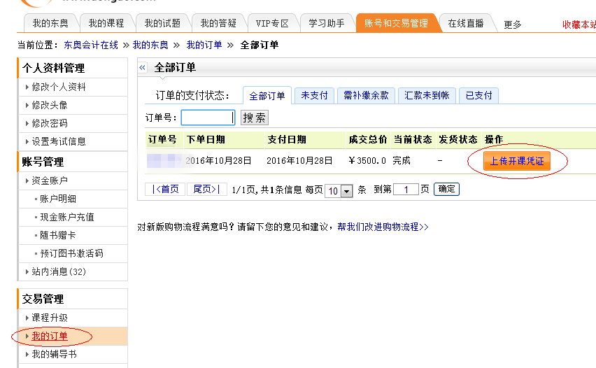 3.在賬號和交易管理里面,點(diǎn)擊我的訂單,可以看到上傳開課憑證按鈕如圖3所示