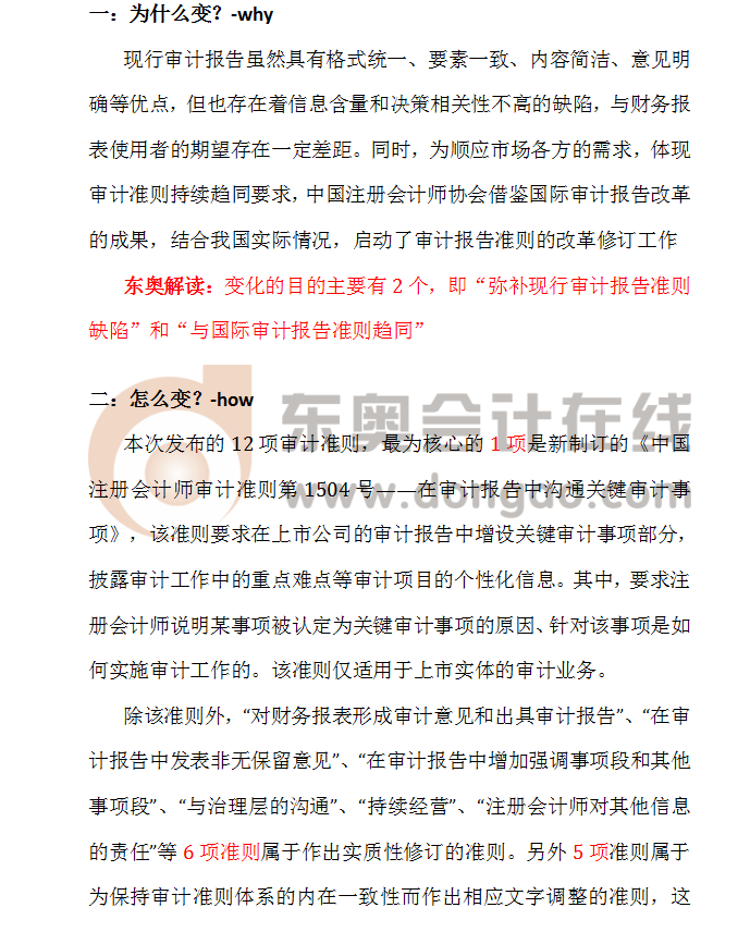 東奧解讀:變化的目的主要有2個(gè),即“彌補(bǔ)現(xiàn)行審計(jì)報(bào)告準(zhǔn)則缺陷”和“與國(guó)際審計(jì)報(bào)告準(zhǔn)則趨同”