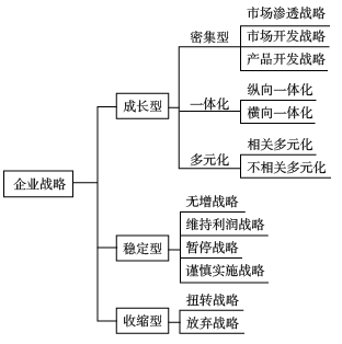 為了實現(xiàn)企業(yè)戰(zhàn)略的目標,企業(yè)戰(zhàn)略通常可以劃分為三種類型:成長型戰(zhàn)略、穩(wěn)定型戰(zhàn)略和收縮型戰(zhàn)略。