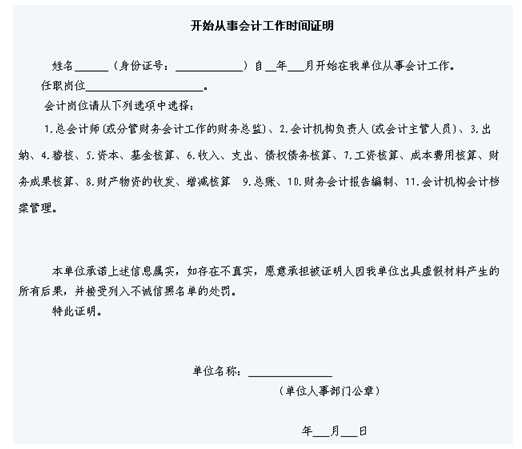 (4)會計(jì)從業(yè)資格證書,沒有從業(yè)資格證書的考生需提供從事會計(jì)工作年限證明材料(模板見附件2,由報(bào)考人員單位提供并加蓋所在單位人事部門公章)。