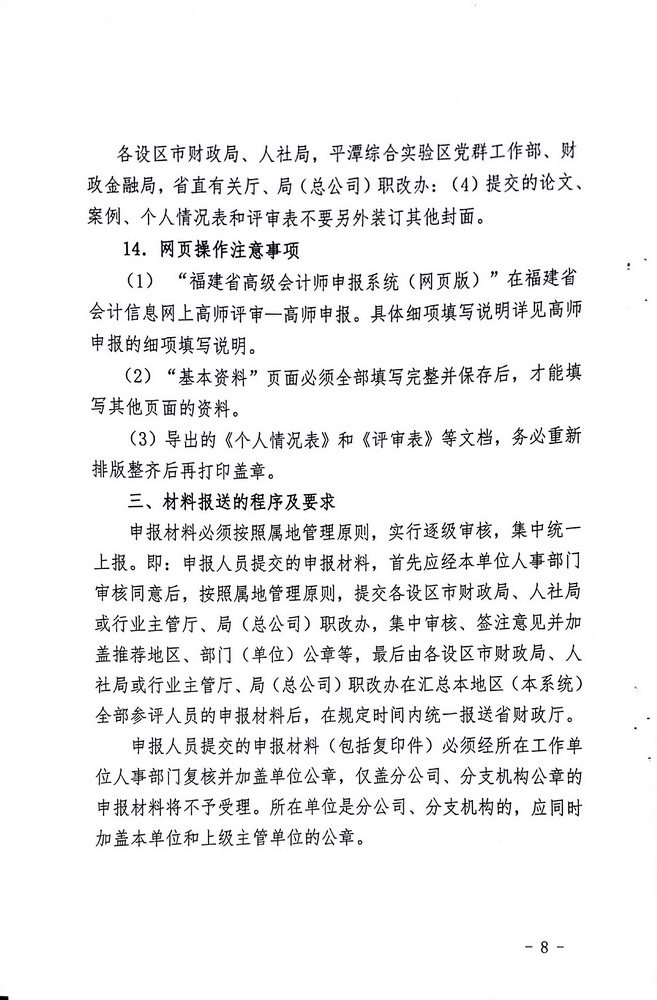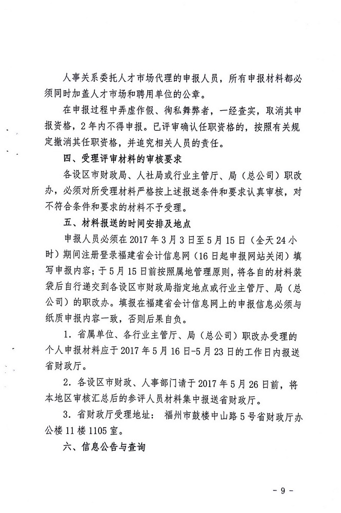 東奧會(huì)計(jì)在線高級(jí)會(huì)計(jì)師頻道提供:福建報(bào)送2016高級(jí)會(huì)計(jì)師評(píng)審材料時(shí)間出爐,申報(bào)人員必須在2017年3月3日至5月15日(全天24小時(shí))期間注冊(cè)登錄福建省會(huì)計(jì)信息網(wǎng)填寫(xiě)申報(bào)內(nèi)容(16日起申報(bào)網(wǎng)站關(guān)閉);于5月15日前按照屬地管理原則,將各自的材料裝袋后自行遞交到各設(shè)區(qū)市財(cái)政局指定地點(diǎn)或行業(yè)主管廳、局(總公司)的職改辦。填報(bào)在福建省會(huì)計(jì)信息網(wǎng)上的申報(bào)信息必須與紙質(zhì)申報(bào)內(nèi)容一致,否則后果自負(fù)。