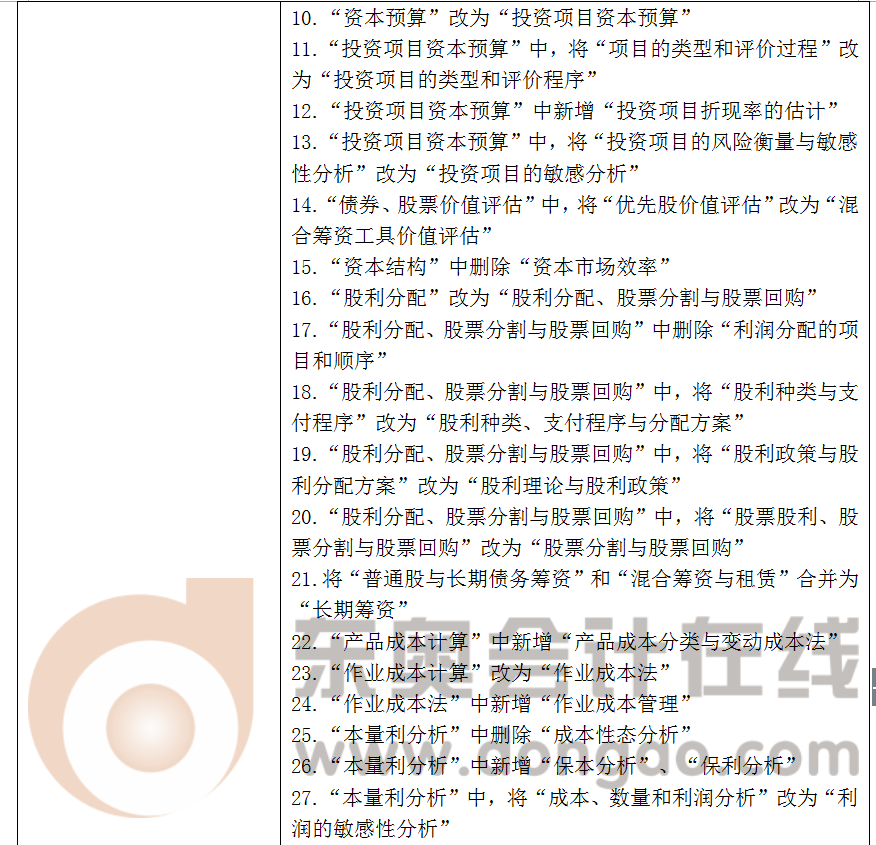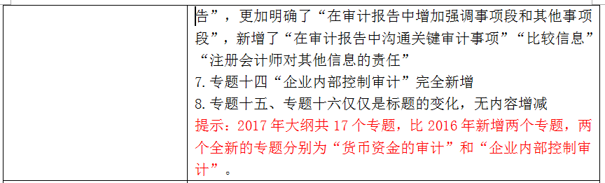 2017年注冊會計師綜合階段考試大綱主要是以“調(diào)整結(jié)構(gòu)”、“新增專題”為主調(diào),其中會計部分章節(jié)進(jìn)行重新整合,同時新增6個專題;審計新增兩個專題;稅法新增一個專題;財管部分進(jìn)行了較大的結(jié)構(gòu)性調(diào)整,部分專題進(jìn)行了合并和拆分,部分專題的名稱進(jìn)行了調(diào)整,新增的2個專題;戰(zhàn)略和經(jīng)濟法各新增1個專題,具體內(nèi)容如下: