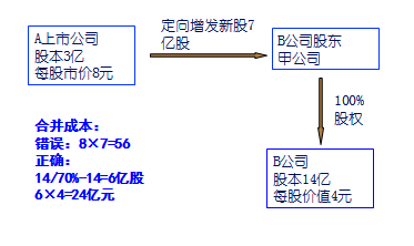 這里是假定B企業(yè)在合并后主體享有同樣股權(quán)比例而發(fā)行本企業(yè)普通股,需要發(fā)行的普通股股數(shù)14/70%-14=6億股。從而此時(shí)需要用6億股乘B公司每股價(jià)值4元來(lái)作為合并成本。