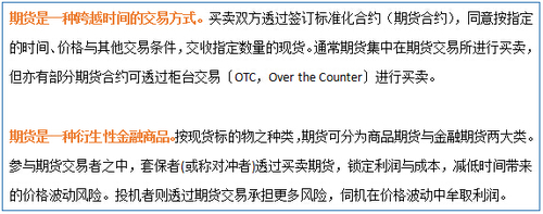 簡單來說,期貨的最大特點(diǎn)從它的名字就能看出來。英文Futures來自future(未來),它的含義是交易雙方可以在約定的未來某一天交收現(xiàn)貨,而不必在買賣初期完成?!捌谪洝迸c“現(xiàn)貨”相對,前者是將來時(shí),后者是現(xiàn)在時(shí)。