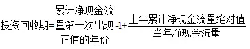 貼現(xiàn)回收期(是指使凈現(xiàn)金流的累計凈現(xiàn)值等于初始項目投資現(xiàn)值所必需的時間期間。試圖彌補回收期忽視貨幣時間價值的缺點。其計算公式為:貼現(xiàn)投資回收期=(累計折現(xiàn)值出現(xiàn)正值的年數(shù)-1)+上年累計現(xiàn)金流量現(xiàn)值的絕對值/當年凈現(xiàn)金流量的現(xiàn)值