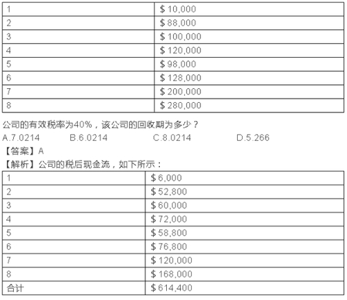 所以在第七年年末還有$3 600($450 000-$446 400)的現(xiàn)金流沒有收回來,所以回收期=7+$3 600÷$168 000=7.0214。