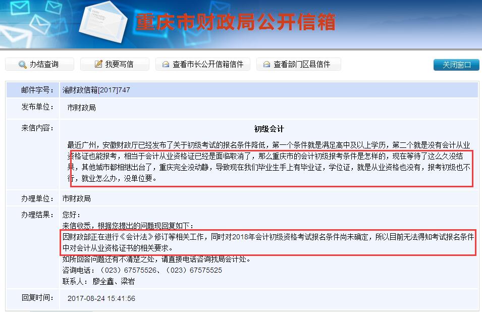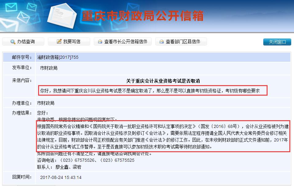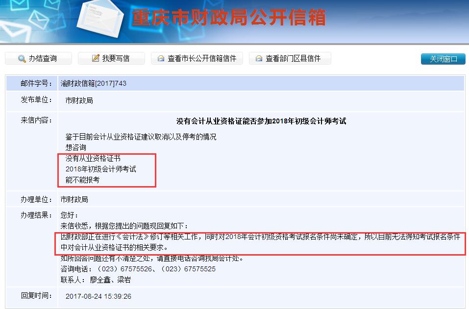 針對(duì)初級(jí)會(huì)計(jì)職稱報(bào)名條件變化和會(huì)計(jì)從業(yè)資格證書(shū)是否取消的問(wèn)題重慶市財(cái)政局公開(kāi)信箱已于8月31日作出最新回應(yīng)。