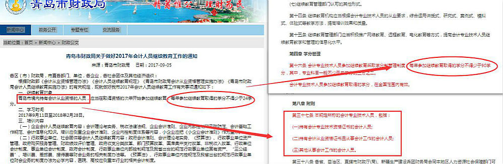 9月5日青島財政局公布《青島市財政局關(guān)于做好2017年會計人員繼續(xù)教育工作的通知》中明確指出2017年青島市境內(nèi)持有會計從業(yè)資格的人員都要接受繼續(xù)教育,取得學(xué)分不得少于24學(xué)分,繼續(xù)教育時間為2017年9月11日至2018年2月28日。