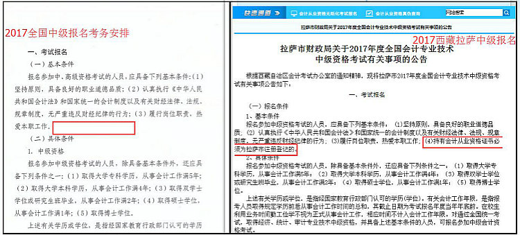 相信參加2017年中級(jí)考試的小伙伴都知道,雖然全國中級(jí)考試考務(wù)安排中沒有規(guī)定持有會(huì)計(jì)證,但在 2017年仍有北京、天津、湖南、西藏、重慶等地報(bào)名中級(jí)需要持有會(huì)計(jì)從業(yè)資格證書,或在考試資格審核中需要提供會(huì)計(jì)證,或要求考生需根據(jù)從業(yè)資格證書屬地選擇報(bào)名審核地點(diǎn)。