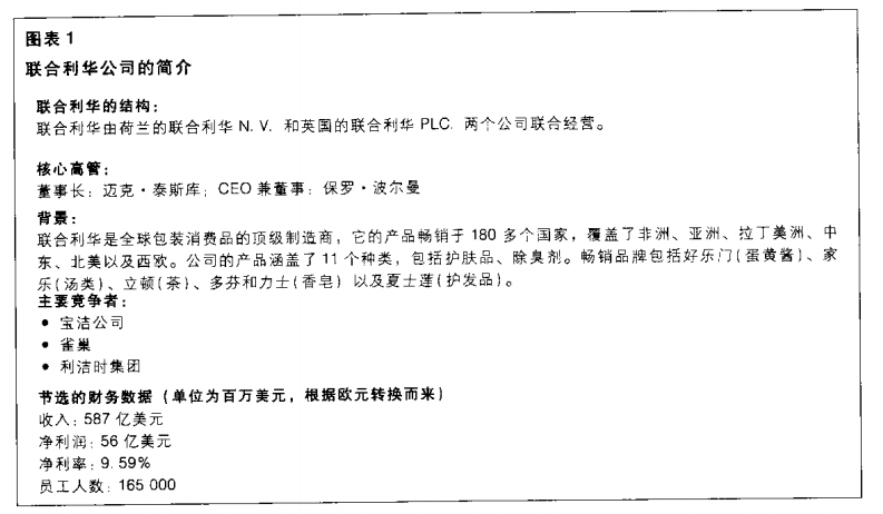 聯(lián)合利華是一家制造消費品的跨國公司。圖表1為公司簡介,聯(lián)合利華的目標為“滿足世界各地人們的日常需求——預測我們的消費者和顧客的愿望,并提供具有創(chuàng)造性和競爭力的品牌產(chǎn)品和服務,以提高人們的生活質(zhì)量”。公司深深扎根于當?shù)匚幕腿蚴袌?,這使得它(聯(lián)合利華)充分掌握當?shù)叵M者的相關知識和跨國經(jīng)驗。聯(lián)合利華有兩家母公司:聯(lián)合利華PLC,總部位于英國;聯(lián)合利華N.V.,總部位于荷蘭。這兩家公司基本上各自作為單獨的法人經(jīng)營,但他們由同一個董事會管理,且兩者之間由祖鐸協(xié)議聯(lián)系著。這些協(xié)議使得聯(lián)合利華在管理、經(jīng)營、股東權利,目的和使命上實現(xiàn)了統(tǒng)一:這些協(xié)議的目的是為了讓兩個公司的股東處于同等地位,就像他們持有同一家公司的股票一樣。