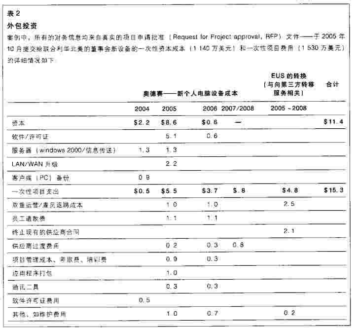 表3概括了外包協(xié)議所帶來的預(yù)期節(jié)省。這種節(jié)約模式將第三方供應(yīng)商對(duì)“每個(gè)席位”或“每臺(tái)個(gè)人電腦”的定價(jià)與聯(lián)合利華現(xiàn)有終端用戶服務(wù)(EUS)的服務(wù)模式成本進(jìn)行對(duì)比。與聯(lián)合利華當(dāng)前的營運(yùn)成本對(duì)比,預(yù)計(jì)每年將節(jié)約1 260萬美元。