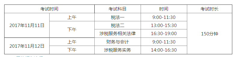 2017年稅務(wù)師考試將于11月11日-12日舉行,一共為五科,每科為150分鐘。具體如下: