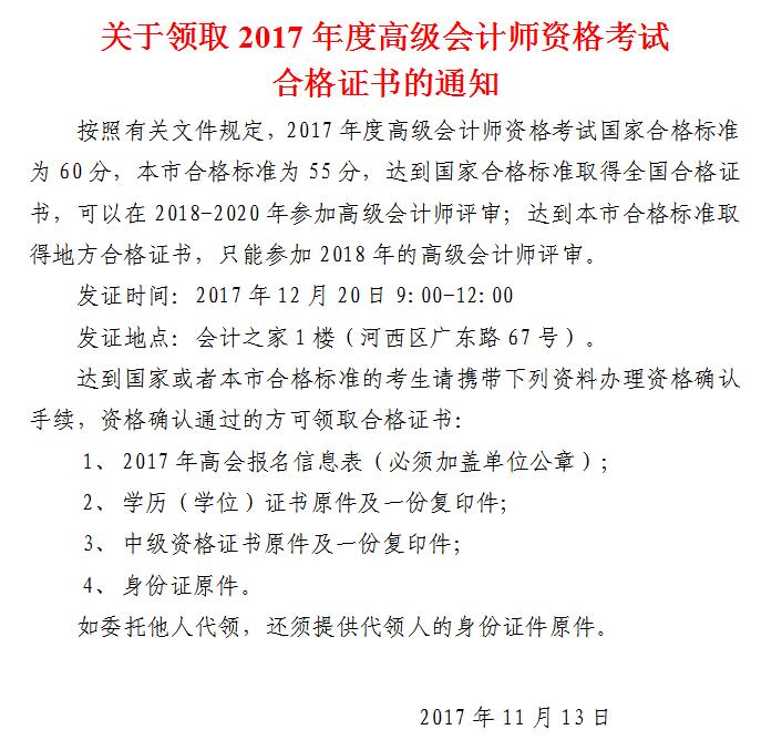 關(guān)于領(lǐng)取2017年度高級(jí)會(huì)計(jì)師資格考試合格證書的通知
