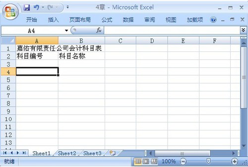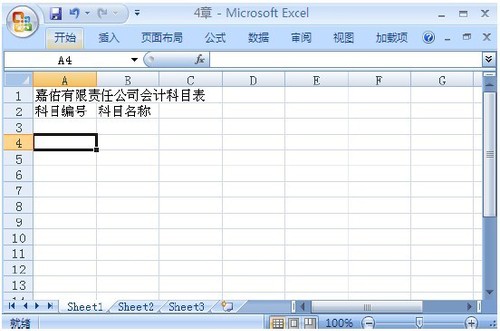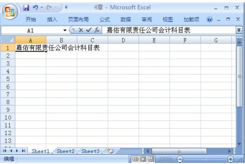 (2) 單擊A1 單元格,輸入公司名稱“嘉佑有限責(zé)任公司會(huì)計(jì)科目表”,如圖4-2 所示。