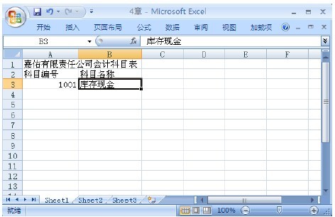 (6) 選擇A3 和B3 單元格,分別輸入“1001”和“庫存現(xiàn)金”,如圖4-5 所示。