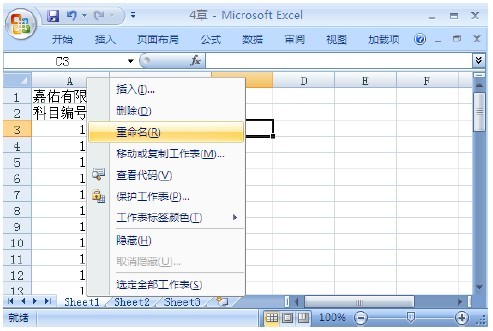 (8) 將鼠標(biāo)光標(biāo)移至Sheet1 的工作表標(biāo)簽處,單擊鼠標(biāo)右鍵,在彈出的快捷菜單中選擇“重命名”命令,如圖4-7 所示。