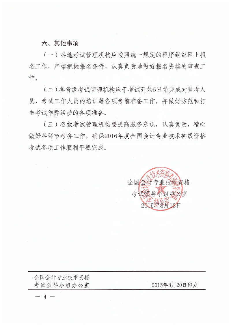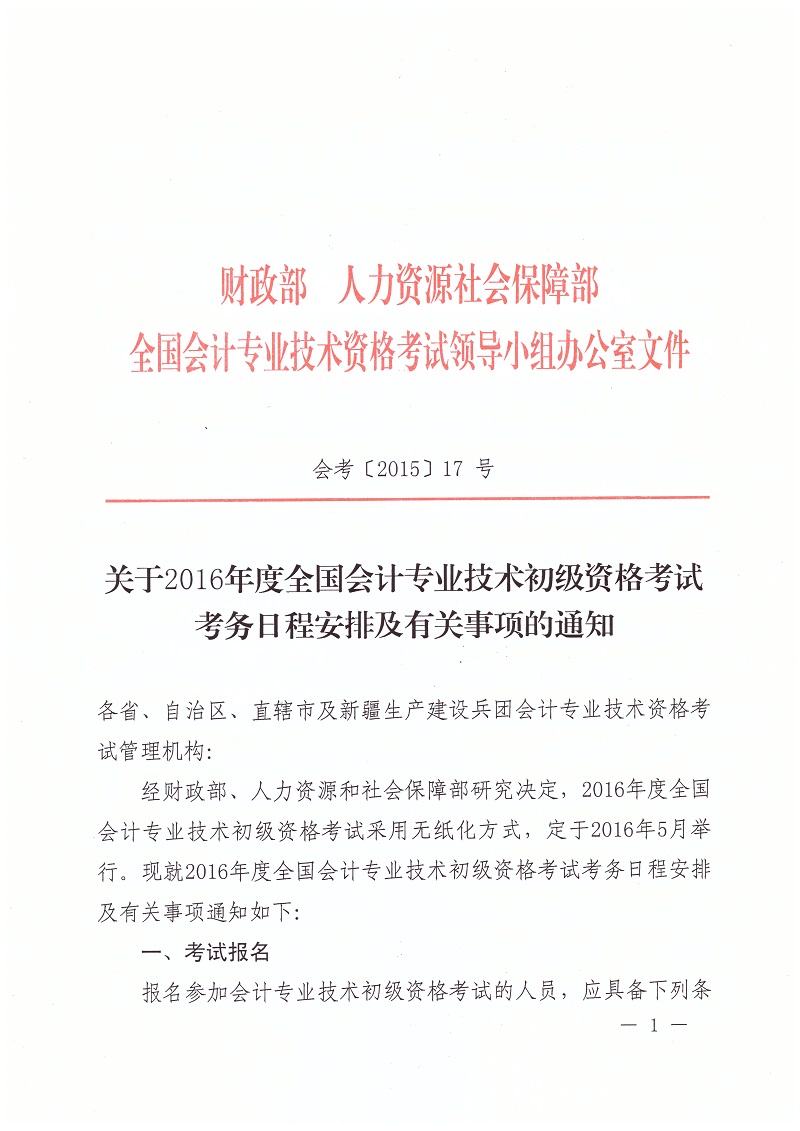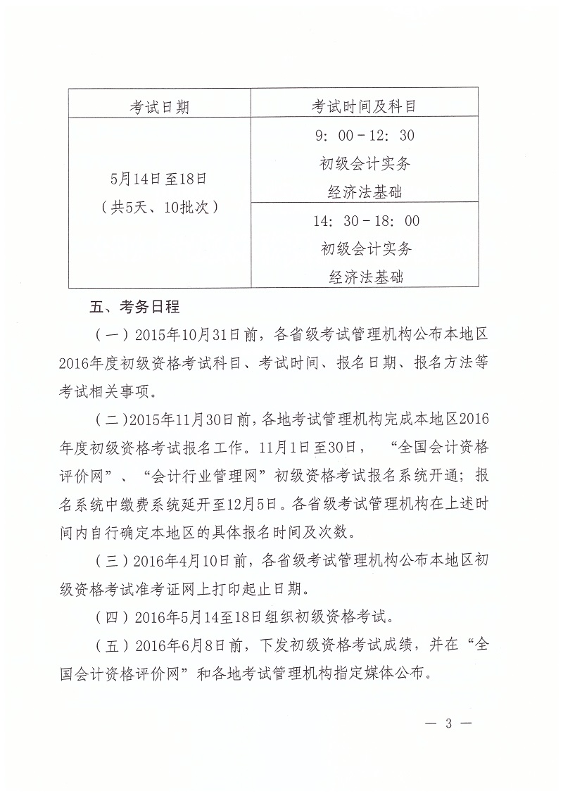 關(guān)于2016年度全國會計專業(yè)技術(shù)初級資格考試考務(wù)日程安排及有關(guān)事項的通知