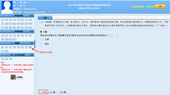 1. 根據(jù)考試科目不同,試題類型分為單項(xiàng)選擇題、多項(xiàng)選擇題、判斷題、不定項(xiàng)選擇題。題號(hào)右方的"*"號(hào)表示該小題還未作答,"?"號(hào)表示該小題做過標(biāo)記??忌梢酝ㄟ^題號(hào)列表查看本考試科目全套試卷的作答情況(包括每道試題的已答或未答狀態(tài)、標(biāo)記狀態(tài)),還可點(diǎn)擊各題號(hào)按鈕,直接進(jìn)入各試題進(jìn)行答題或檢查。