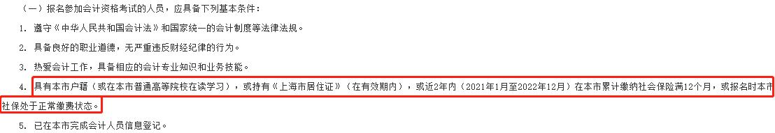 部分地區(qū)要求考生在報名時,提供居住證、戶籍證或社保繳納證明等。例如,上海在23年考務安排中要求:具有本市戶籍(或在本市普通高等院校在讀學習),或持有《上海市居住證》(在有效期內(nèi)),或近2年內(nèi)(2021年1月至2022年12月)在本市累計繳納社會保險滿12個月,或報名時本市社保處于正常繳費狀態(tài)。