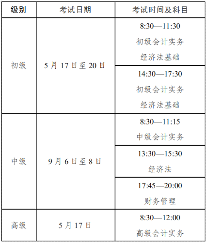 初級(jí)資格考試于2025年5月17日至20日舉行,考試科目包括《初級(jí)會(huì)計(jì)實(shí)務(wù)》、《經(jīng)濟(jì)法基礎(chǔ)》;中級(jí)資格考試于9月6日至8日舉行,考試科目包括《中級(jí)會(huì)計(jì)實(shí)務(wù)》、《經(jīng)濟(jì)法》、《財(cái)務(wù)管理》;高級(jí)資格考試于5月17日舉行,考試科目包括《高級(jí)會(huì)計(jì)實(shí)務(wù)》。具體安排如下: