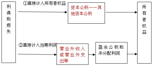 利得和損失可能直接計入所有者權益,也可能先計入當期損益(利潤表中的營業(yè)外收入或營業(yè)外支出),最終影響所有者權益(因為利潤表最終會影響到未分配利潤)。