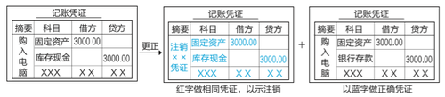 更正方法:①記賬后發(fā)現(xiàn)記賬憑證科目錯誤的,如下圖所示更正記賬憑證,并據(jù)以分別用紅字和藍字登記入賬。