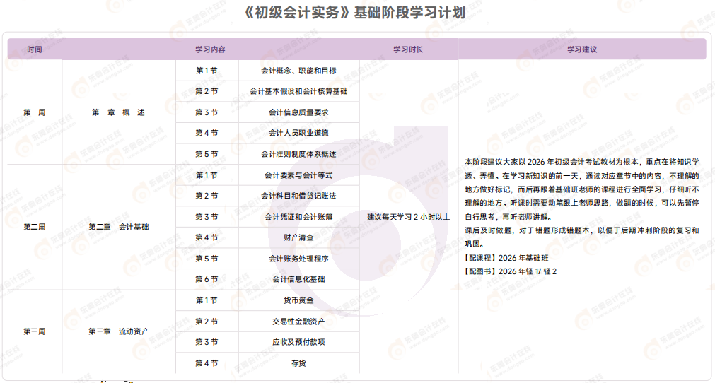 2026年初級(jí)會(huì)計(jì)考試基礎(chǔ)階段備考已經(jīng)開啟,東奧為考生們帶來了《初級(jí)會(huì)計(jì)實(shí)務(wù)》基礎(chǔ)階段學(xué)習(xí)計(jì)劃,助力大家高效備考,快來領(lǐng)取吧!