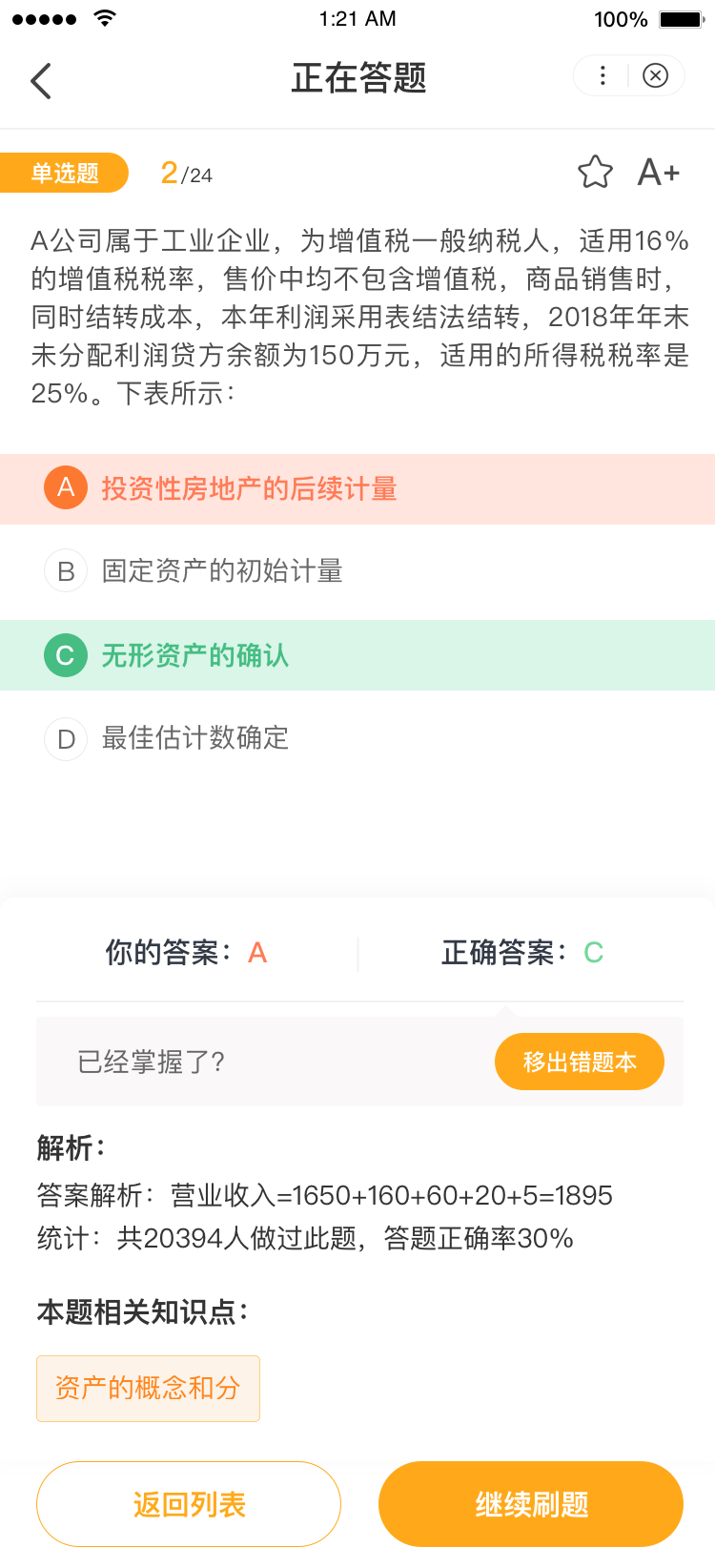 進(jìn)入答題頁面后,大家根據(jù)題型選擇正確答案即可,如果出現(xiàn)錯(cuò)題,程序會(huì)給出大家答案解析以及相關(guān)知識(shí)點(diǎn),幫助大家更好的掌握錯(cuò)題原因,避免下次錯(cuò)誤。