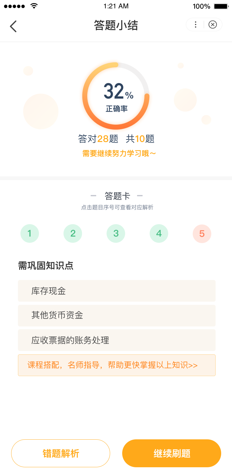 在答題結(jié)束后會(huì)出現(xiàn)大家的答題報(bào)告,其中包括答題量、答對(duì)數(shù)量以及正確率,幫助大家了解自己的知識(shí)點(diǎn)掌握情況。