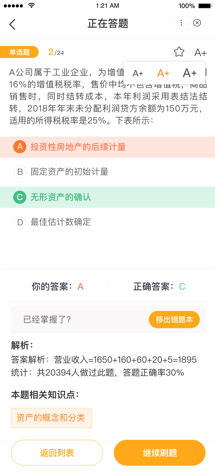 做題時大家可以用滑動的動作進(jìn)行頁面跳轉(zhuǎn),方便大家單手進(jìn)行操作。如果覺得字體太小,大家可以點擊右上角“A+”進(jìn)行調(diào)整字體大小。