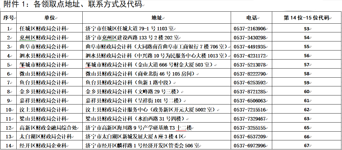 證書管理號第14至15位,為領(lǐng)取地代碼,如XXXXXXXXXXX53XXXXXX,領(lǐng)取地點為任城區(qū)財政局會計科。濟寧市14個領(lǐng)取點詳細(xì)信息見附件1。