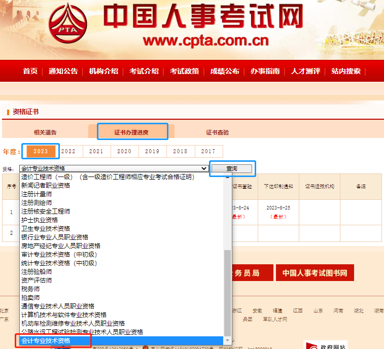 第二步:點擊“證書辦理進度”,選擇“2023”、資格下拉框內“會計專業(yè)技術資格”,點擊查詢就可以看到初級證書辦理進度了。