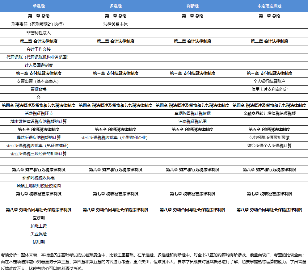 整體來看,本場(chǎng)考試中經(jīng)濟(jì)法基礎(chǔ)的難度不大,依然是秉持“重點(diǎn)恒重”原則,對(duì)于第四章和第五章的考查仍然是整套試卷中的重點(diǎn),在單選、多選和判斷題上呈現(xiàn)“遍地開花”的特點(diǎn),對(duì)全書八章的內(nèi)容均有考查,且內(nèi)容均比較基礎(chǔ),不涉及“偏難怪”的題目,比較常規(guī)。不定項(xiàng)選擇題則是集中對(duì)于第三章、第四章和第五章的知識(shí)點(diǎn)進(jìn)行了考查,且考查內(nèi)容均屬于課程和圖書中老師強(qiáng)調(diào)的重點(diǎn)內(nèi)容。