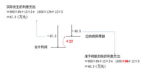 【解析】(1)向金融企業(yè)借款的利息支出,準(zhǔn)予據(jù)實(shí)扣除,可扣除金額=900×6%÷12×3;(2)向非金融企業(yè)乙公司借款的利息支出,不超過金融企業(yè)同期同類貸款利率計算的數(shù)額的部分,準(zhǔn)予在稅前扣除,可扣除金額=1800×6%÷12×3;(3)如果采用間接法計算應(yīng)納稅所得額,應(yīng)納稅調(diào)增27萬元[參考下圖]。