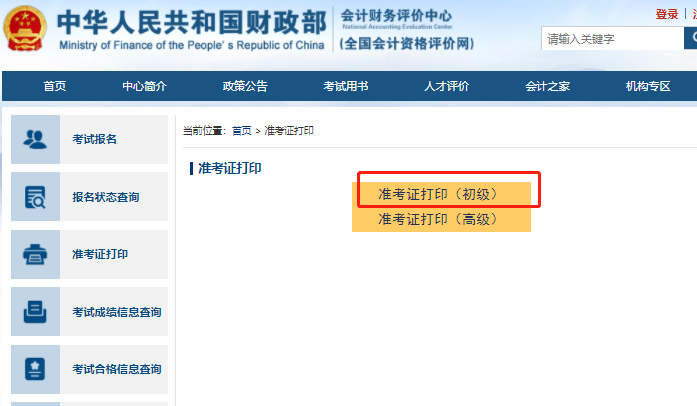 第一步:打開“全國會計資格評價網(wǎng)”,并點擊頁面左側(cè)的“準(zhǔn)考證打印”按鈕。