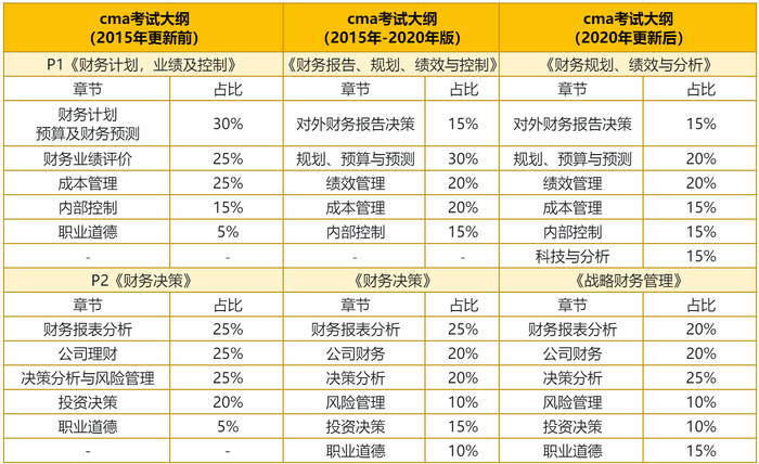 cma考試與中級、注會等考試不同,cma考試大綱和教材并非每年調整。根據(jù)以往cma考試大綱的更新頻率,大概每五年進行更新一次,自2020年新考綱更新實行后,考試難度調整為C級,分值比重也有一定的變化,2023年考試仍使用現(xiàn)有考試大綱,不做新的調整。現(xiàn)將歷年CMA考試大綱更新內容整理如下,可參考: