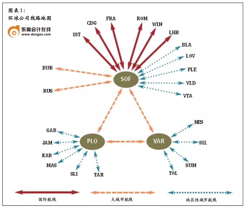 接著,這位CEO向大家展示了圖1所示的圖解,并概括了當(dāng)前的運(yùn)營情況。“環(huán)球的國內(nèi)業(yè)務(wù)以首都(SOF)為主要樞紐,另外還有兩個(gè)位于PLO和VAR的分樞紐。公司從SOF發(fā)出的航班,目的地可達(dá)六個(gè)國際終點(diǎn)站,四個(gè)國內(nèi)大城市(包括PLO和VAR)以及五個(gè)小城市。在PLO和VAR之間有直達(dá)航班。此外,從PLO發(fā)出的航班可達(dá)六個(gè)地區(qū)性小城市,從VAR發(fā)出的航班可達(dá)四個(gè)地區(qū)性城市。表1列示了我們每天的航班日程表?!?/span>