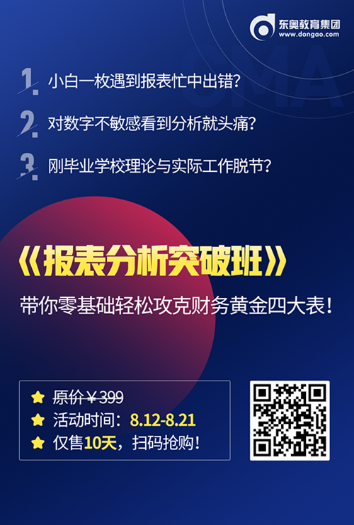還在因為你是職場小白不懂報表而害怕嗎?還在因為你對數字不敏感而感到頭疼嗎?還在因為你是剛畢業(yè)的大學生而擔心與社會脫節(jié)嗎?針對以上考生們迫切想改變的事情,東奧CMA特別推出了《報表分析突破班》課程,由名師助力,為您排憂解難,帶你零基礎輕松攻克財務黃金四大報表!