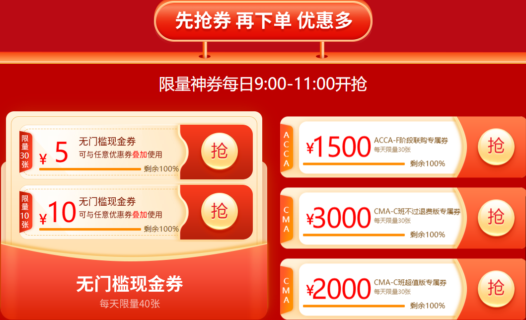 (1)無(wú)門(mén)檻優(yōu)惠券:現(xiàn)金券無(wú)門(mén)檻可疊加優(yōu)惠券使用,僅適用于購(gòu)買(mǎi)網(wǎng)課;有效期自領(lǐng)取之日起3天。