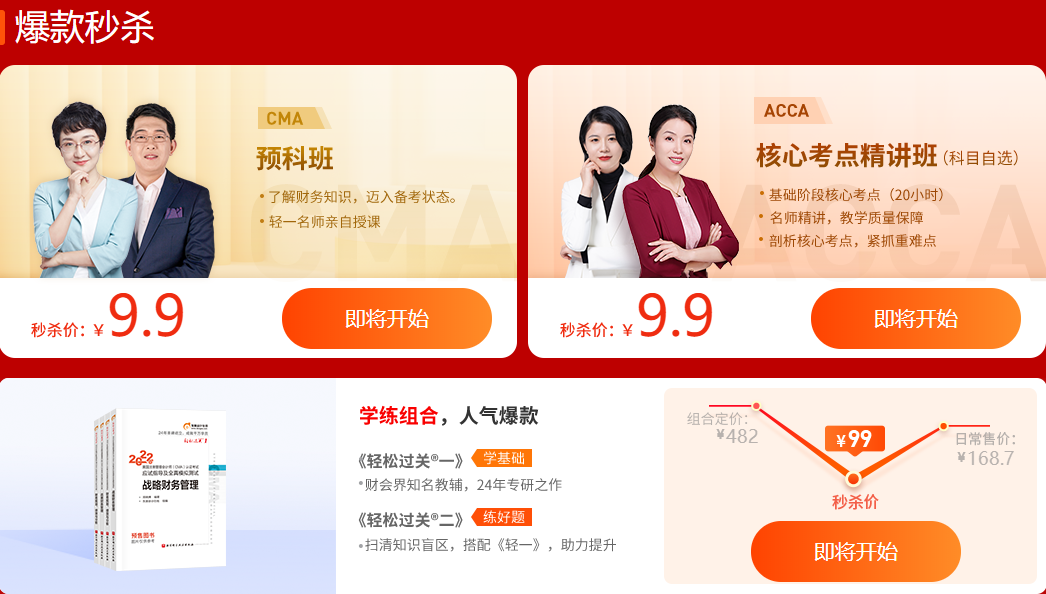 (1)限時(shí)秒殺商品包括2022年CMA預(yù)科班,2021年ACCA核心考點(diǎn)精講班(科目自選),2022年CMA《輕一》&《輕二》組合,其中2022年CMA預(yù)科班