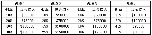 選項3預(yù)期現(xiàn)金流量=$50000×0.1+$75000×0.2+$100000×0.4+$125000×0.3=$5000+$15000+$40000+$37500=$97500。
