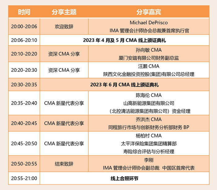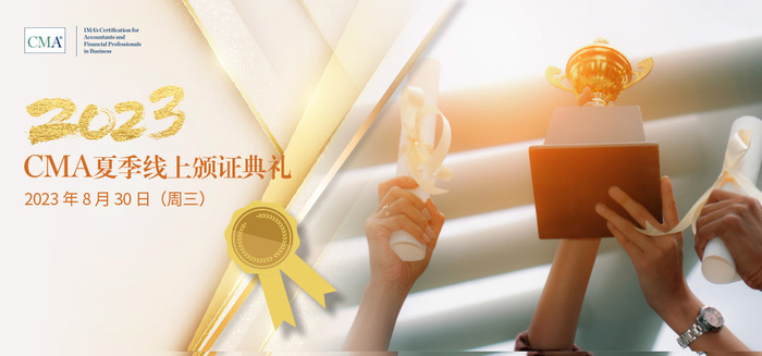 在這個金秋送爽,疊翠流金的八月,又一批財務(wù)管理專業(yè)人士加入了cma大家庭!為祝賀新晉持證者獲得cma取證證書,并給即將參加考試的考生分享備考經(jīng)驗以及學(xué)習(xí)心得,助力管理會計專業(yè)人士開啟全新的職業(yè)旅程,IMA管理會計師協(xié)會將定于8月30日(周三)晚間20:00-21:00舉辦2023cma夏季線上頒證典禮。本次活動將采用線上直播方式進(jìn)行,歡迎屆時登錄相關(guān)頁面觀看直播、參與互動。