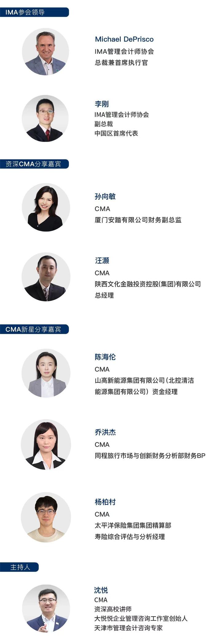 本次活動中,IMA總裁兼首席執(zhí)行官Michael DePrisco先生、IMA副總裁兼中國區(qū)首席代表李剛先生將在線上和與會者溝通交流。同時,我們也將邀請到兩位資深cma持證者:廈門安踏有限公司財務(wù)副總監(jiān)孫向敏女士,陜西文化金融投資控股(集團(tuán))有限公司總經(jīng)理汪灝先生帶來他們深耕管理會計領(lǐng)域多年來的心得體會,以及管理會計在實踐過程中的知識運用經(jīng)驗與價值體現(xiàn)。除此之外,還將有三位新晉優(yōu)秀cma持證者受邀與大家見面,分享他們與cma證書的故事、成功備考經(jīng)驗,以及給考生的建議,精彩內(nèi)容切勿錯過!