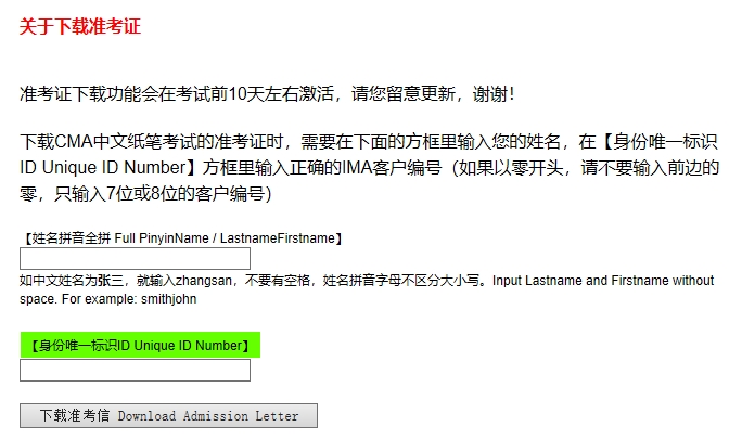 第二步:在空格內(nèi)輸入考生本人的姓名全拼、IMA會(huì)員號(hào)(不要輸入會(huì)員號(hào)前面的0,只輸入后面7位或8位的編號(hào)),選擇準(zhǔn)考證并下載。