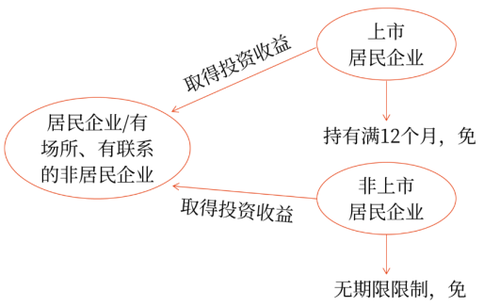 居民企業(yè)或非居民企業(yè)取得的免稅投資收益不包括連續(xù)持有居民企業(yè)公開(kāi)發(fā)行并上市流通的不足12個(gè)月股票取得的投資收益;持有非上市居民企業(yè)股票則沒(méi)有期限限制。